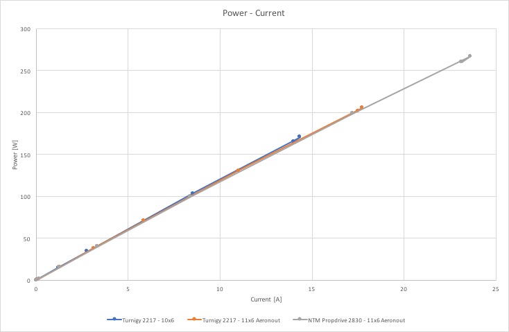 Wanneer het Vermogen tegen Ampere in en grafiek wordt gezet zie ik voor het eerst een resultaat waar ik iets mee kan. De NTM Propdrive heeft de hoogste vermogen met de bijbehorende hogere stroom gebruik. Dit is ook te verwachten omdat de specificaties van deze motor het hoogst zijn. Ik heb de motor gemeten op 267 Watt, wat overigens aanmerkelijk minder is dan de 385 Watt die op de verpakking staat (al moet ik zeggen dat ik niet alle tests gedaan heb met een volle accu, maar de tests waren kort en dus de ontlading minimaal). De Turnigy 2217 met de 11×6 prop geeft een maximaal vermogen van 205 Watt.