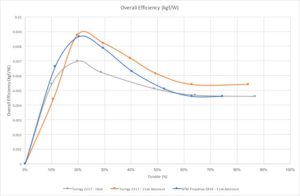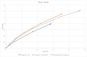 De hoofd reden om deze tests te doen zijn om te kijken welke combinatie van motor en propellor de meeste voortstuwingskracht geeft. De laatste grafiek geeft dan ook de meest waardevolle informatie. De Turnigy & 11×6 combinatie geeft een maximale voortstuwingskracht van 1,1kg bij een vermogen van 205 Watt en een stroom van 17,7 A. De PropDrive geeft een voortstuwingskracht van 1,22kg bij een vermogen van 267 Watt en een stroomsterkte van 23,6 Ampere. De Propdrive met de 11×6 prop is dus de meest krachtige combinatie, al heeft hij ook het hoogste stroomverbruik. Voor de F5J welke in aanbouw is met een geschat vlieggewicht van ongeveer 1,1kg zijn allebij de combinaties goed te gebruiken.