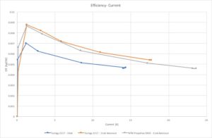 Ik heb de Efficiëntie van de motor geplot tegen de opgenomen stroomsterkte. Het wordt mij hierbij duidelijk dat deze motoren niet echt heel efficient zijn… Het lijkt me handig om dit grafiekje maar even te negeren…